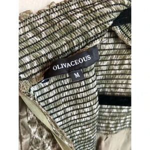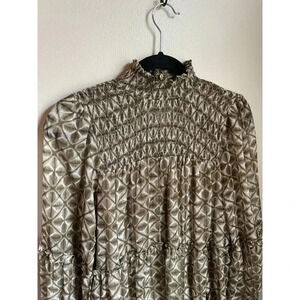 Olivaceous Sage Olive Green and White Mock Neck Dress with Smocking, Long Sleeve