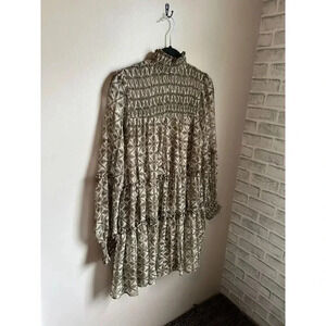 Mock neck dress. Lightweight dress with smocking at the top. Loose and flowy. Pair with cowboy boots or tall brown boots. Great for a fall outing.