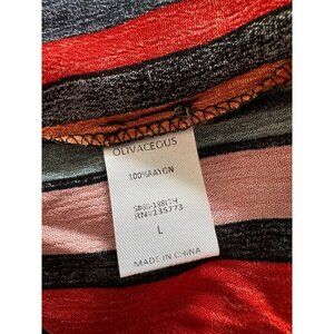 Stunning olivaceous V neck blouse in size large, made of soft rayon. Features a tie detail and striped pattern in green, orange, and black. Perfect for casual or office wear.