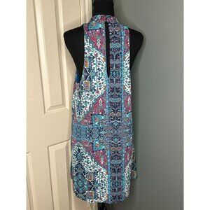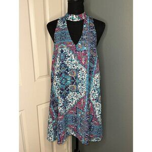 Olivaceous Women's Large Geometric Keyhole Cutout Sleeveless Mini Dress Condition: Excellent pre-owned condition; no rips, stains or tears Size: Women's Large Color: Multi Material: Polyester Fully lined High neck / Mock neck style Hook and Eye closure at neck Hand wash only All measurements provided in photos are approximate only. Non-smoking and pet free environment. Fast shipping.