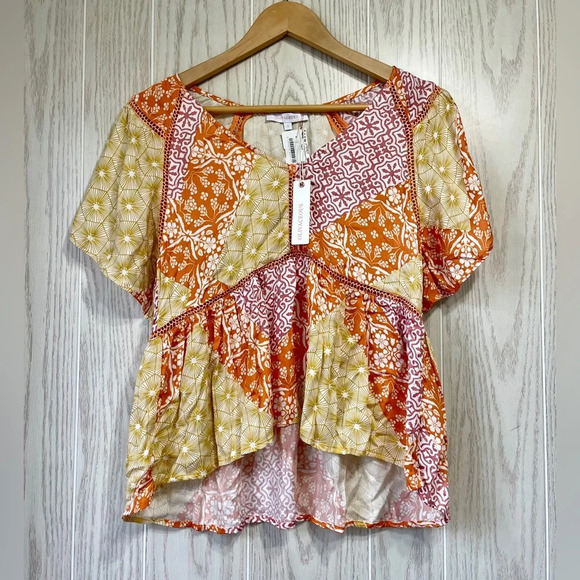 Olivaceous Womens Medium Blouse Orange White Geometric S/S Woven V Neck NWT