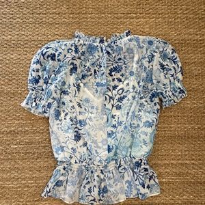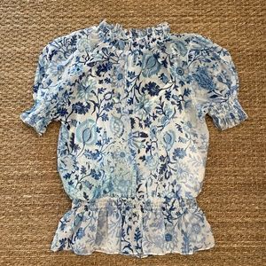 Olivaceous blouse in blue and white print. Built in tank. Size Medium.