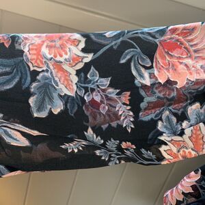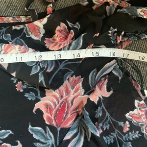 This beautiful blouse is even more adorable in person. It is a very dark navy blue, not black.. it has adjustable straps, ruffle that go along the front and back neckline and also along the left and right sides.. it’s fully lined in the body portion