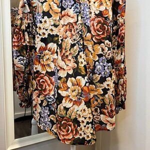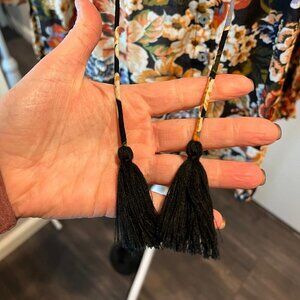 Olivaceous floral ruffled peasant blouse with tassels, size Medium