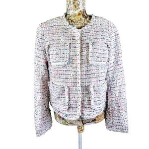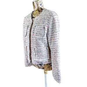 Beautiful, Lush white jacket with blue, pink, white, violet and sparkles tweed accents. Ribbon stripes on sleeves, large snap closures, four real pockets and lots of charm!