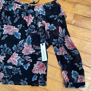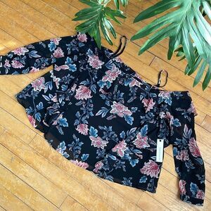 NWT Olivaceous off the shoulder black floral sleeved blouse! Size M but measurements taken flat are approximately 17.5” pit to pit, 17” from top hem to bottom hem, 18” long sleeves. Straps are adjustable.