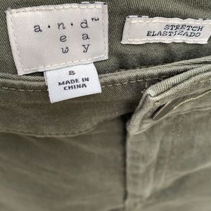 Great for fall are these olive cropped pants. They are not ankle grabbers—just a nice straight leg that stops well above the ankle. These pants are soft and comfortable. 68% cotton, 30% Lyocell and 2% spandex, they are comfortable and flexible. Size 8