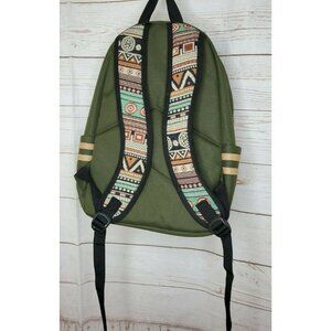 Olive green backpack with abstract pocket design and multiple compartments including unique back zipper