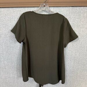 Super cute and effortless olive green blouse featuring a button-front design and a stylish tie-front. Lightweight fabric with short sleeves and a flattering V-neckline. Perfect for pairing with jeans, shorts, or skirts. Size M, fits like a L or XL