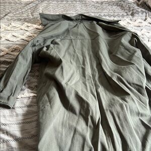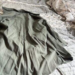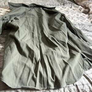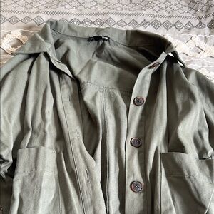 Stylish olive green shacket with button-up front and pockets. Perfect for casual outings.