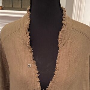 Chic chocolate brown top with frayed edges. Ideal for everyday style.
