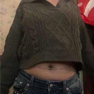 Stay cozy and stylish with this olive green cable knit sweater. Perfect for layering, this sweater offers both comfort and elegance.