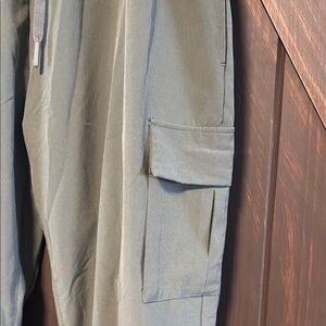 Stylish olive green joggers with cargo pockets. Comfortable elastic waistband. Perfect for casual wear.