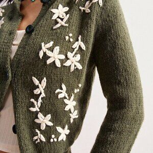Olive Green Casual Women's Floral Embroidered Button-Up Cardigan