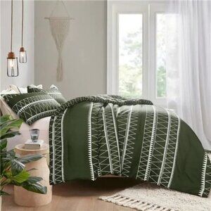 Olive Green Comforter Set King (104"×90"),Reversible Green Boho Triangle Pattern