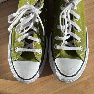 Platform Converse All Star high top sneakers in a vibrant shade of olive, chartreuse green 🫒 Only worn twice with minimal scuffs noted in pictures. Modern insoles are cushioned/comfy, and low platforms add a subtle height.