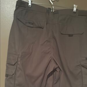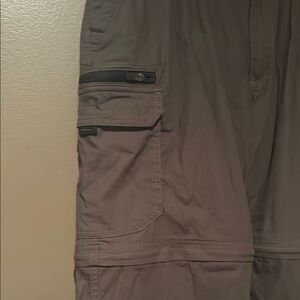 These olive green cargo pants feature a relaxed fit and an elastic waistband for comfort. Made from sturdy material, they are designed for casual wear and outdoor activities. The full-length design ensures versatility for various occasions. These are convertible, they are pants and you can zip off the bottoms to make them shorts.