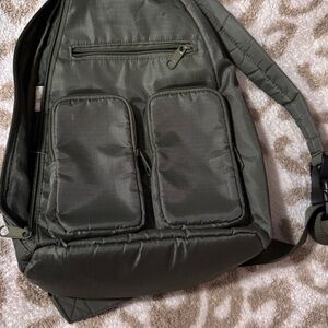 Stylish and versatile olive green sling bag perfect for everyday use. Features multiple compartments for easy organization.