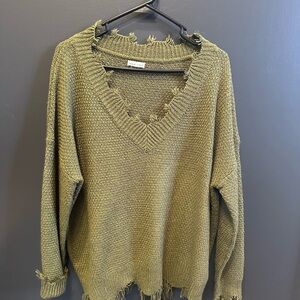 Stay stylish and cozy with this olive green distressed V-neck sweater. Perfect for layering and adding a touch of edge to your outfit.