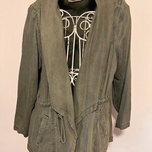 Gorgeously green jacket with flattering drape and a tie waist to adjust fit. Fabric is unbelievabley soft. Perfect for spring wear!