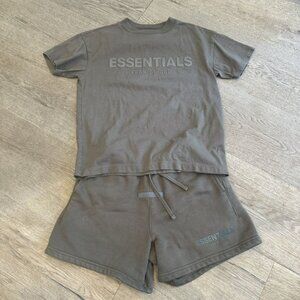 Awesome tonal Essentials shorts and tee. Great set! The sizes are how I felt best matched fits as the shorts run a bit big. Shirt is 8 and shorts are 6/7. Overall fits between size 7-9. Great condition just minor wear from wash.