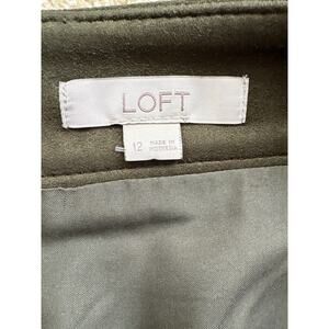 Size 12 olive green faux suede skirt with exposed back zipper and two front zip pockets. Classic straight cut with modern microfiber suede texture. Measurements: waist 34”, length 19.25”. A versatile piece that can be styled with boots and tights for fall, a button-down for workwear, or a leather jacket for festivals and nights out. Works year-round for city, office, or casual weekend looks. Laundering recommended upon receipt.