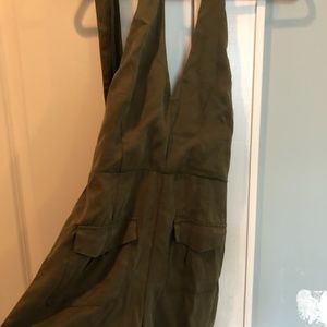 front pockets, optional tie, olive green, open back, adjustable buttons on neck, size 4 but could fit a 6, worn once
