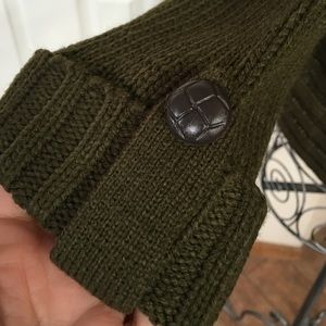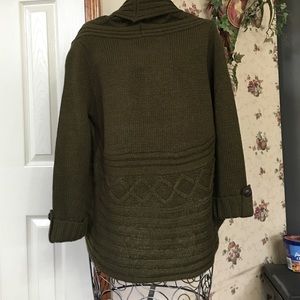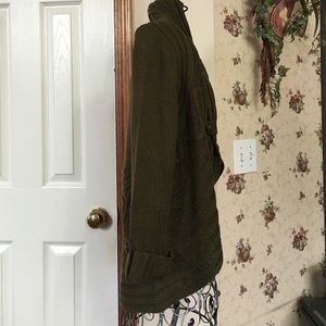 Olive green 3/4 sleeve, hi-low sweater / shrug with button detail at chest and cuff of sleeves! NWT. Sleeves are 20"