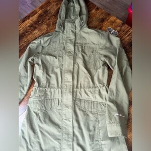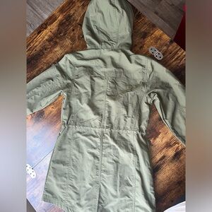 Stylish olive green parka jacket with a hood. Perfect for casual outings.