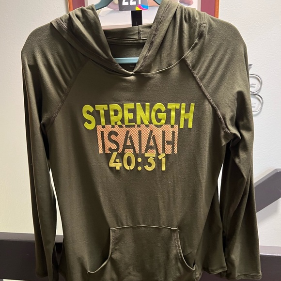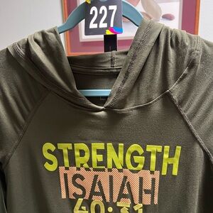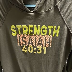 Embrace comfort and motivation with this olive green lightweight hoodie featuring an inspiring 'Strength Isaiah 40:31' design. Ideal for casual wear, it combines style and encouragement. length 24”, pit to pit 20”.