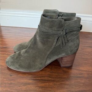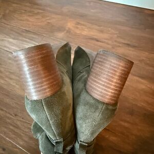 Step out in style with these chic olive green suede ankle boots. These boots are a ladies size 8 medium. They have a almond toe with an inside ankle zipper and the heel height is about 2 inches. These are in very good near excellent condition used condition. They are a brushed suede in the color olive green. Depending which way I move my fingers can create a different look on the boot like you know a different kind of like shading. These are perfect for any occasion and offer both comfort and elegance. All of my items are well cared for and come from a smoke free home.