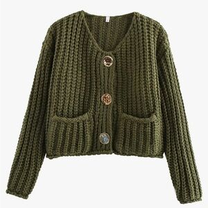 Stay cozy and stylish with this olive green knit cardigan sweater. Perfect for layering, this sweater adds a touch of warmth and elegance to any outfit.
