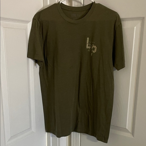 Stylish olive green t-shirt with a unique graphic design. Perfect for casual wear. Live fit soft tee.