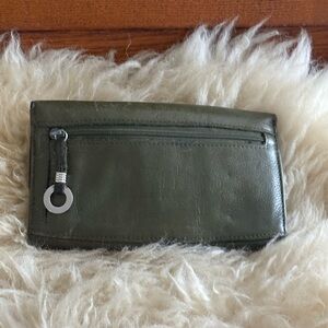 Olive Green Leather Tri Fold Checkbook Wallet with Flap Closure