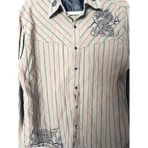 Olive green long sleeve striped button up top with snap closures, embroidered dragon/snake accent at front, back and collar.