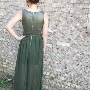 This gorgeous Olive Green maxi dress is a size Medium. I am 5'7 and it reaches the floor on me. There are no flaws or damages, and it comes from a smoke and pet free home. This item will be freshly steamed before receiving.
