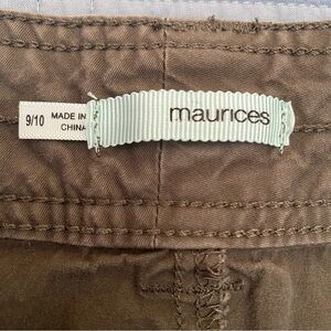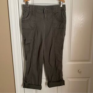 by Maurices. Features a sleek convertible design of pants with button accents or roll up to Capri style with practical pockets. Ideal for everyday wear. A spot on the leg. Cotton and spandex blend. Size 9/10 or a 34” waist. Streetwear. Gorpcore. Grunge. Punk. Y2K style. Army Green. Hiking. Outdoors. Festivals. Lightweight.