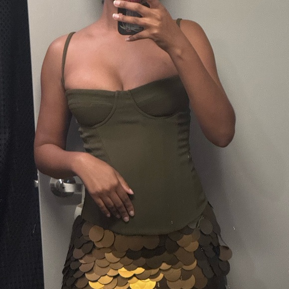 Chic olive green mini skirt featuring eye-catching gold accents. Perfect for a night out or a stylish day look.