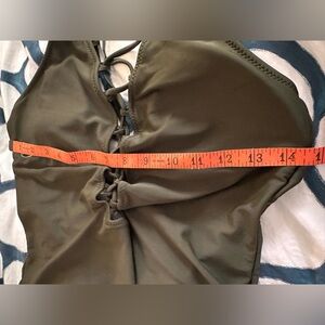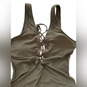 Olive Green One Piece Lace Front Swimsuit. Plunging back. See measurements for size- no size or care tags.