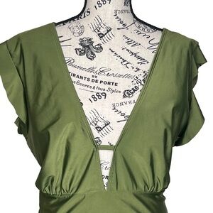 Olive Green One Piece Swim Suit Women’s Size 3X Plunging V-Neck Open Back Flutter Sleeve