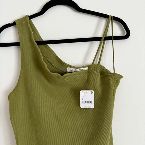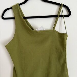 Stylish olive green ribbed one-shoulder top. Features a unique strap design.