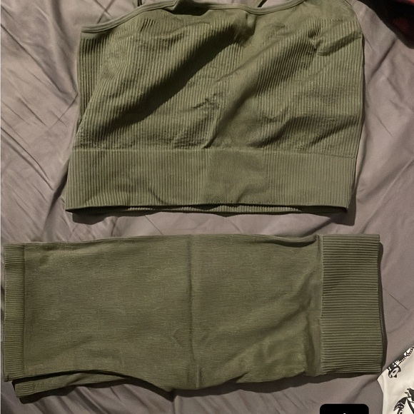 Stylish olive green ribbed two-piece set. Includes a top and bottom. Perfect for casual wea or athletic wear