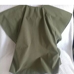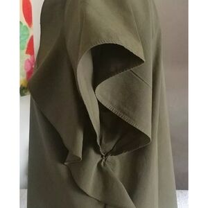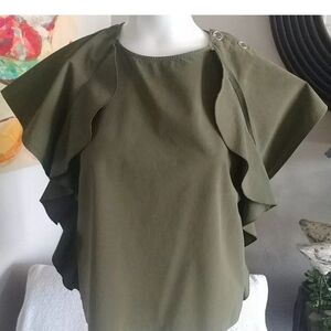 Stylish olive green ruffle blouse paired with elegant navy pants. Perfect for a chic and comfortable look.