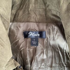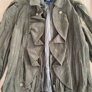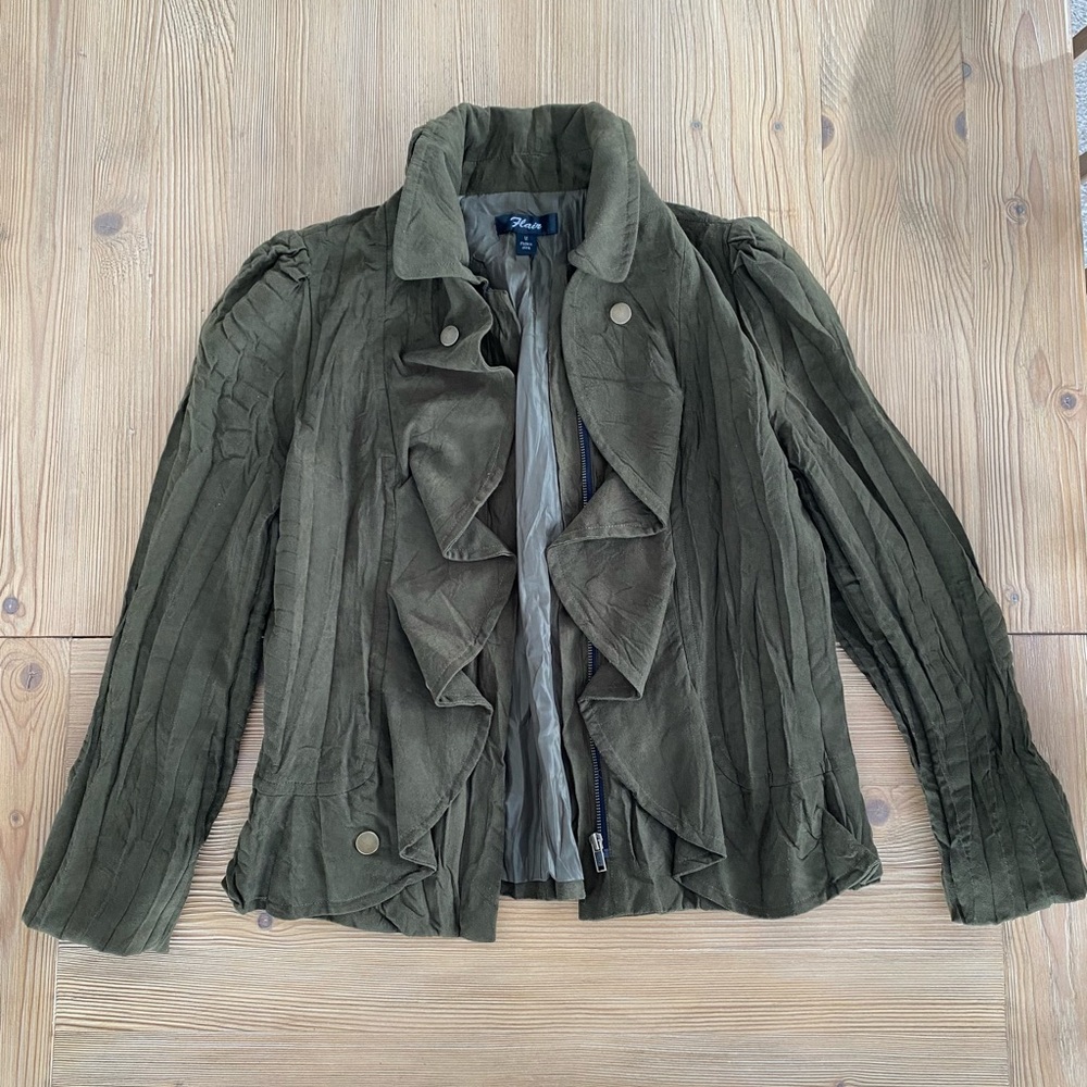 flair olive green jacket with elegant ruffle detailing. Perfect for adding a touch of sophistication to any outfit.