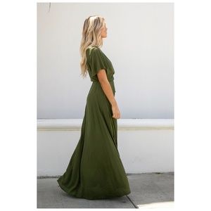 Olive green solid rayon gauze short flutter sleeve, lined skirt true maxi dress with functional chest tack.