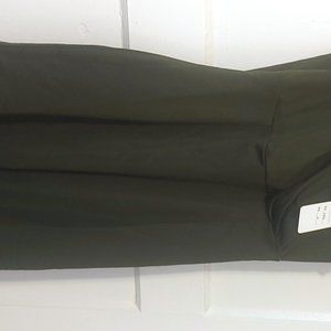 New with tags, a dark olive green sleeveless faux wrap ruching sheath knee-length midi dress with a wide v-neck. Stretches a bit with its cotton blend material, it's marked a size medium, its bust is goes from 35" to 37". Zipper closure down the back.
