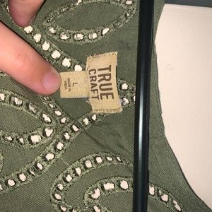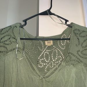 Olive Green True Craft Dress, originally purchased from Belk! Super comfy dress and love the color. You can tie the tassels on dress or let them hang loose. The top is very pretty as well! #dress #truecraft #greendress #casualdress #belk