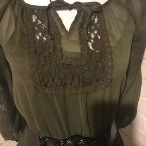 Olive green dress/tunic, cinched elastic waist, 3/4 sleeves with lace details, tie scoop neck with lace below. Attached lining. Belt not included. Will ship same or next business day from a non smoking home!