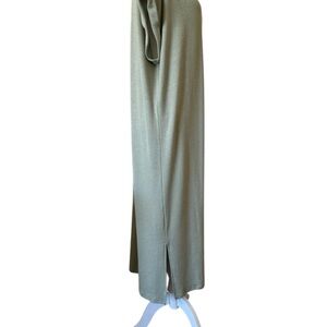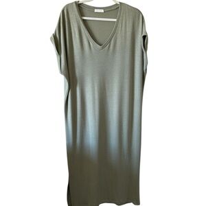 Stylish olive green maxi dress with a V-neck design. Soft knit fabric makes this a comfortable choice for any occasion. Oversized flowing fit, side slits and nice folded cap sleeve detail. Never worn. NWOT