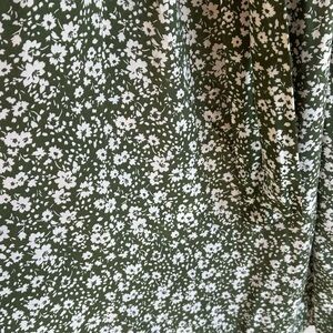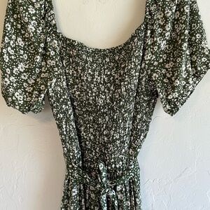 Olive Green & White Ditzy Floral Smocked Bodice Puff Sleeve Midi Dress Sz 1X